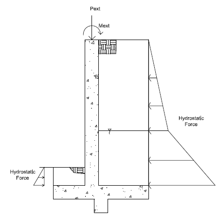The stem wall design is analyzed along its height to come up with axial, shear and moment diagrams. The wall is designed for the worst case forces at the critical section. The program checks 20 locations over the height of the wall to determine the critical section. For a cantilevered uniform stem wall, the critical section is always at the wall intersections with the top of footing. For a propped retaining wall and/or one with a batter, this will be somewhere along the length of the wall. The program will take any externally applied loads in combination with hydrostatic pressures, surcharges, etc. The program will then factor the loads according to load combinations to come up with the axial, shear and moment diagrams.