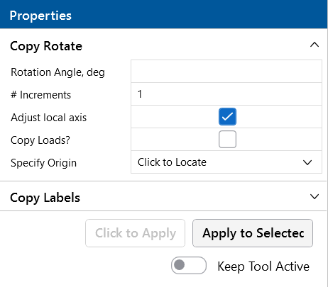 For example, suppose you wish to copy the selected part of your model in six 30° increments (for a total of 180°). You would enter "180" as the rotation angle and "6" as the number of increments. For the polar origin, enter the X and Z coordinates for the origin where you want the rotation to pass through the XZ plane.Checking the Adjust Local Axis box causes the local axis of each element to be rotated with the newly created model elements. Otherwise, the member local axes will retain their original orientation with respect to the global axes.