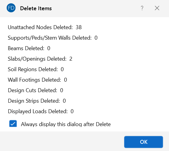 If you wish to delete based on the current selection state, you must use the check boxes to define the criteria the program will use to perform the deletion. Only items that are selected and that have their check boxes "checked" will be deleted. The choices let you delete nodes, supports, beams, slabs, soil regions, wall footings, design cuts, design strips and/or displayed loads.