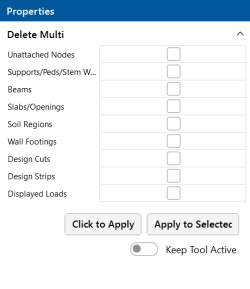(Optional) Click on the Keep Tool Active slider if you want the ‘Delete Multi’ list to remain open in the Properties panel, so that you can delete additional model elements.