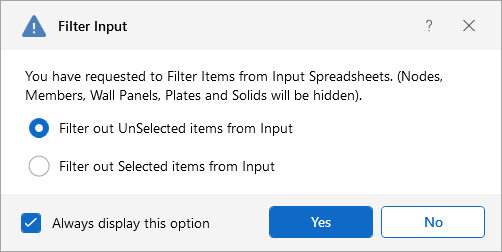 option in the Selection Toolbar. You have the option to filter out the UnSelected items or the Selected items from the Input Spreadsheets.