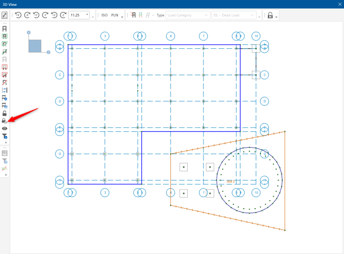 button causes all currently unselected elements to become visually dim or grayed out. While in the dim lock state, you will not be able to click on these dimmed elements, nor will they graphically show any labels or results. This is useful for when you want to keep a portion of your structure for visual reference only but also have it stay out of your way when modeling or reporting graphical results.