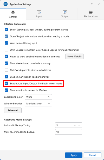 In addition to the graphic display, both the Input and Result Spreadsheets automatically filter information based on the elements that are selected in viewer mode. This automatic filtering can be turned off on the General tab of the Application Settings.