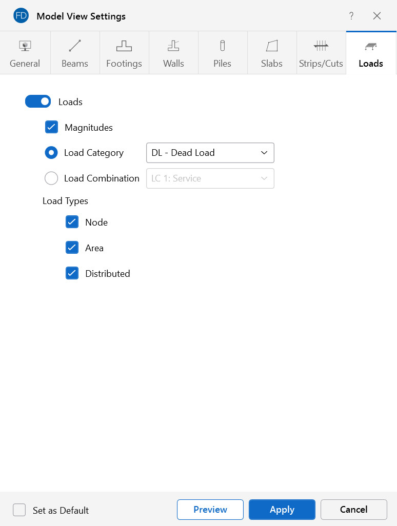 Access the graphical Model View Settings for loads by clicking the Model icon in the View Settings section of the View ribbon and selecting the Loads tab shown below.