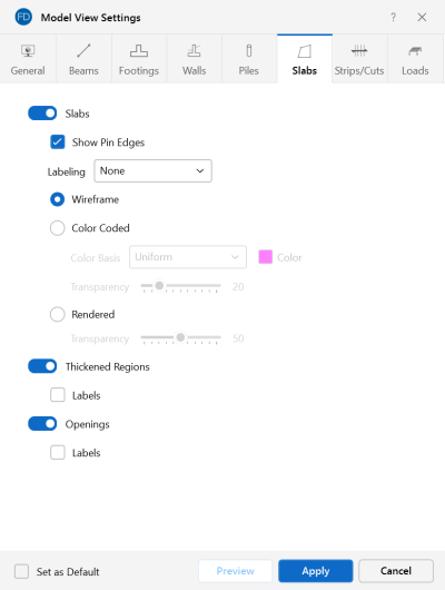 Access the graphical Model View Settings for slabs by clicking the Model icon in the View Settings section of the View ribbon and selecting the Slabs tab shown below.