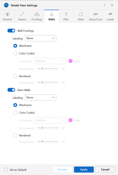 You can specify that no wall footings or stem walls are displayed, or you can show them with a Label, Color Code or Rendered.