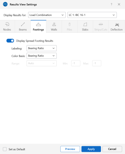 Access the graphical Results View Settings for spread footings by clicking the Results icon in the View Settings section of the View ribbon and selecting the Footings tab.