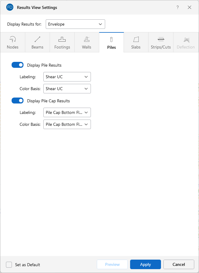 Access the graphical Results View Settings for piles by clicking the Results icon in the View Settings section of the View ribbon and selecting the Piles tab.