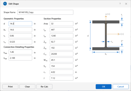 - Click the Re-Calc button to have the program calculate the new Section Properties automatically.