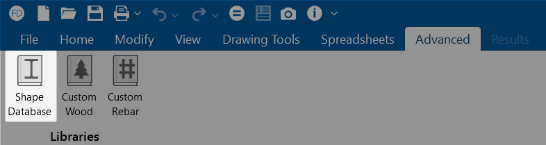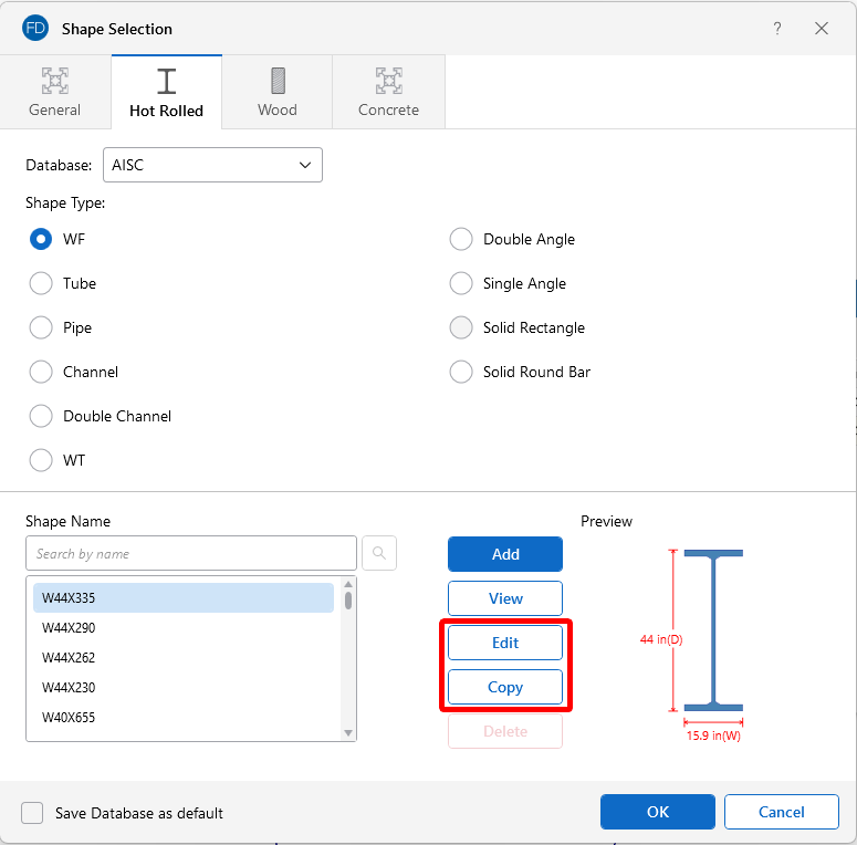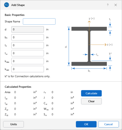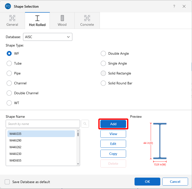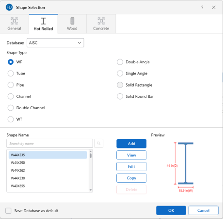 Shapes are organized by Shape Type and Database / Manufacturer. Common shapes are supported such as; wide flanges, tubes, pipes, channels, etc. You can type in the names directly, select shapes from these databases or add your own shapes.