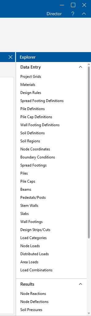 The Explorer panel is an affixed panel on the right side of the program interface that contains a list of all the Data Entry spreadsheets. When a solution is present, it also displays the Results spreadsheets. Similar to the Properties panel, you can hover your mouse over the left edge of the panel and drag to expand or shrink the panel horizontally. Click the caret next to the Data Entry or Results title to collapse or expand the spreadsheet list.