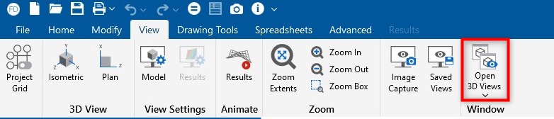 Model View windows show a graphic view of the model. Open a new view using the Open 3D Views button, shown below.