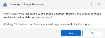 After adding a new shape in your model, you will be prompted with the Changes to Shape Database dialog, shown below. Click Yes if you want to add the shape to your Shape Database to be available for all future models. Click No if you do not want the new shape to be available for other models, this will not save the shape to your Shape Database.