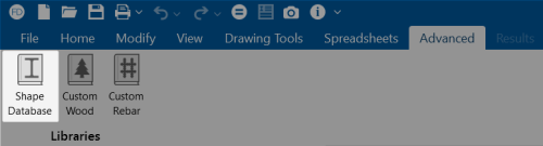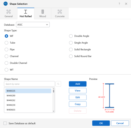 For each material, there are several databases of common structural shapes such as Hot Rolled Steel, Wood, and Concrete. You may type in the shape names directly, select shapes from these databases or add your own shapes.