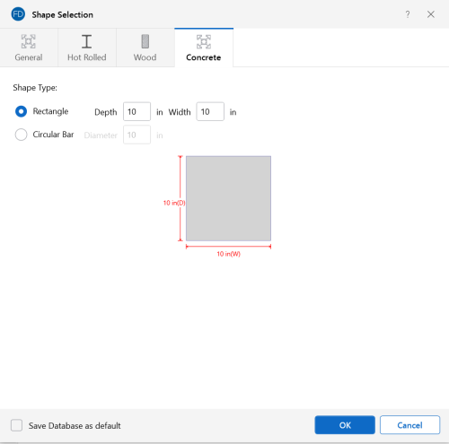 Concrete shapes do not have a predefined database like hot rolled steel and wood. Instead, they are defined using a parametric shape code that may be assigned any depth or width. There are two types of shapes currently supported: Rectangular and Round. For more information, see Beams - Database.