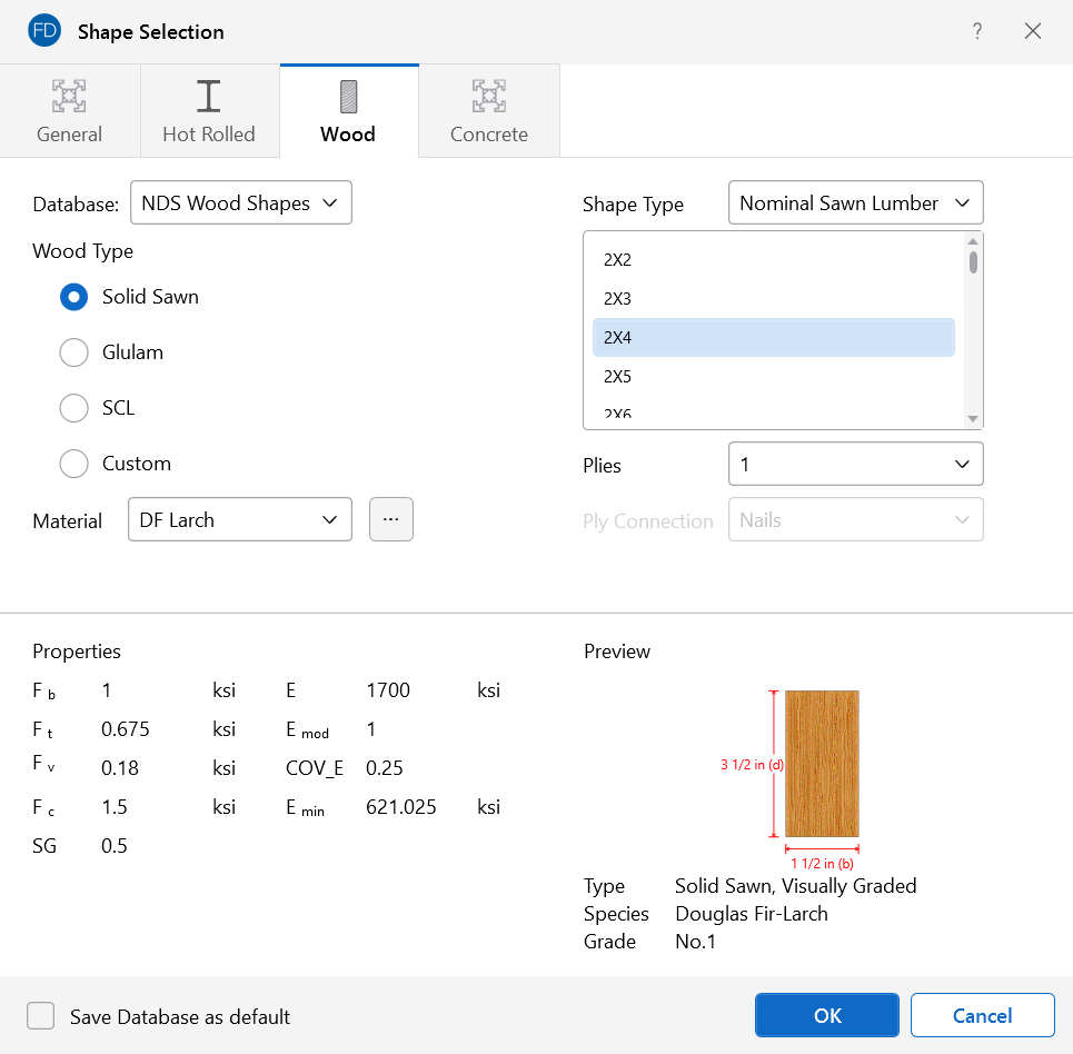 The available wood shapes are based on the dimensional lumber and post and timber shapes given in the NDS or CSA O86, depending on which database you have chosen. You may also design for multiple plies of these shapes. Note that the NDS dimensional lumber shapes are all nominal sizes. CSA O86 shapes are actual sizes.