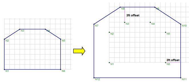 Offset Distance - Allows you to increase or decrease your slab edges by a fixed distance. Enter a positive number to enlarge the slab and a negative number to shrink the slab footprint. For example, if you indicate a 3 ft offset distance, the slab edges will be offset linearly by 3 ft on all sides.