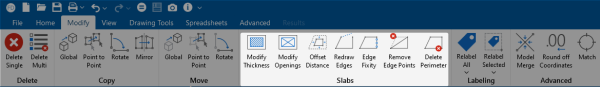 There are several options available for modifying your overall slab geometry in the Slabs section of the Modify Ribbon.