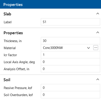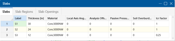 There are a number of ways to modify slabs. You can view and edit the slab data in the Slabs Spreadsheet, which can be accessed by selecting Slabs from the Data Entry drop-down on the Spreadsheets tab of the ribbon, or by clicking Slabs from the Data Entry section of the Explorer panel. You may also select a slab (or multiple slabs) to view and edit the properties in the Properties panel. Here you can adjust the material, thickness, local axis angle, analysis offset, passive pressure, soil overburden and Icr factor. Clicking the