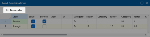 You may click the LC Generator button to have the program generate load combinations based on a variety of Building Codes. For more information, see Generating Building Code Combinations.