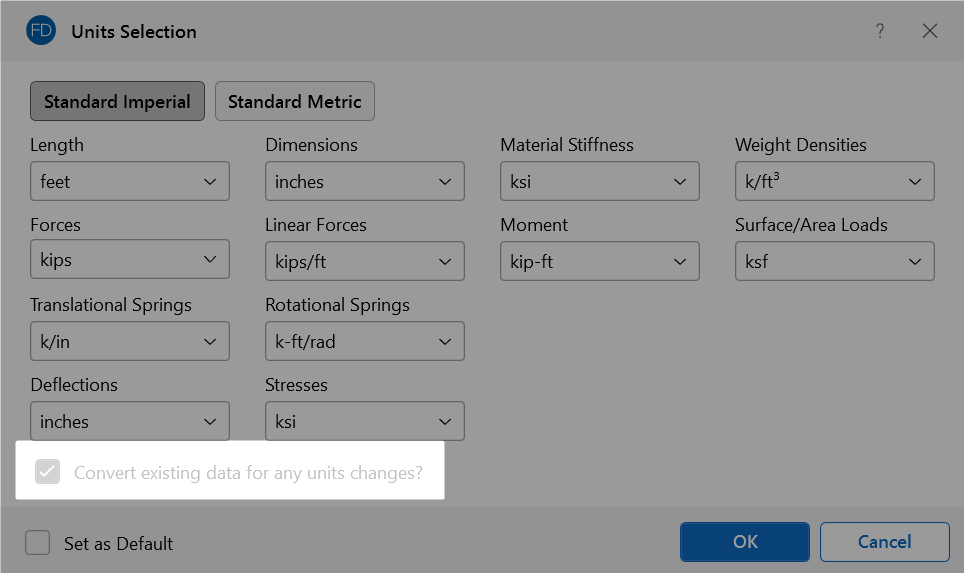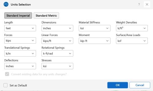 You may save any of the units as the default setting so that when you start a new model that information is already set for you. To do this, simply enter the information that you want to save and check the Save as Default box and click OK.