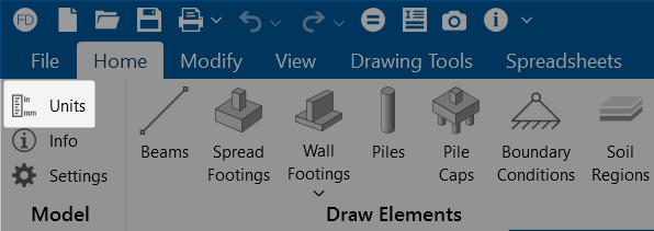 You can work with imperial units (kips, inches, etc.), metric units (KN, meters, etc.), or any combination of the two. The current units appropriate for each data item are shown at the top of the data columns in the spreadsheets and with the plot of values in the model view.