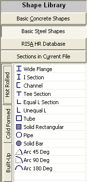 The shape library provides basic shapes that are used for building sections. Located on the left side of the application, the library is divided into four categories: Basic Concrete Shapes, Basic Steel Shapes, RISA HR Database, and Sections in Current File. Basic Concrete Shapes: This tab contains concrete sections with different geometric shapes. These shapes may be modified by editing the dimensions in the shape editor or by simply resizing with the mouse. The resizing with mouse will modify the overall dimension of the section and proportionally change the component dimensions. Basic Steel Shapes: This tab contains general steel shapes that can be modified in the same way that Basic Concrete Shapes can be. It has been further subdivided with vertical tabs on the left into the following three groups: hot rolled shapes, cold formed shapes and built-up shapes. RISA HR Database: This tab contains a database of Hot Rolled Steel members that is taken from the designated Database. These shapes can not be manipulated. Sections in Current File: This tab contains the current sections that the user has created in this file. Note that you can create multiple sections within one file. You need to be careful with naming of your sections. See Section File Names and Toolbars to get more information on this. |