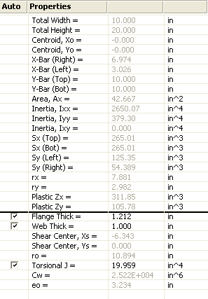 This window displays all of the calculated cross sectional shape properties for the current Section. These entries change depending on the Material and Shape Type selected in the Section Information window. Please see the Section Properties topic for more information on the individual properties.