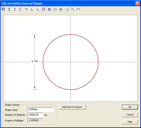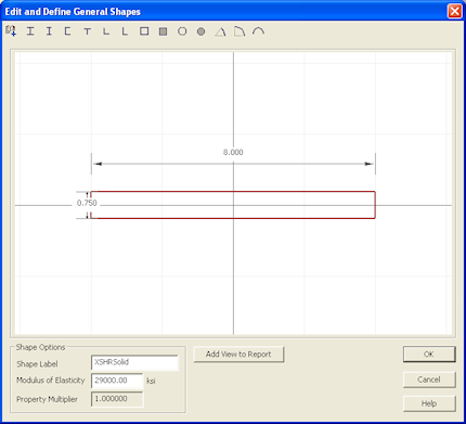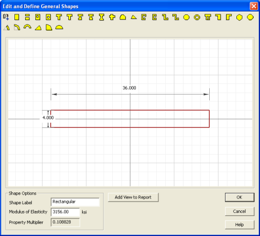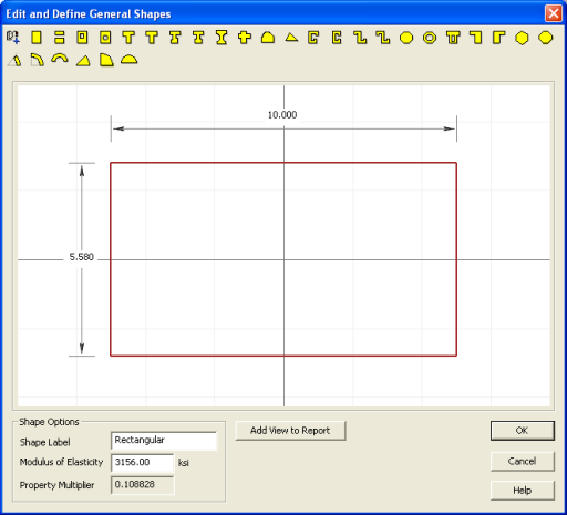 Notice that the Rectangular shape has a Multiplier of 0.108828. This is because you selected it from the Basic Concrete Shapes library. This means that the Rectangular shape has a Modulus of Elasticity equal to 0.108828 x 29000 ksi = 3156 ksi.