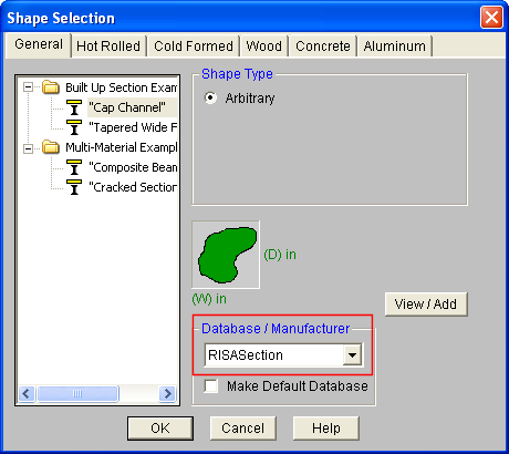 Shapes that are designated as General Material Type in RISASection will be found on the General tab under the RISASection Database/Manufacturer.