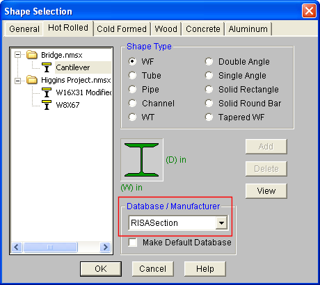 within RISA-3D, RISA-2D, or RISAFloor. Shapes that are designated as Hot Rolled Steel Material Type in RISASection will be found in the Hot Rolled tab of the Shape Database under the RISASection Database/Manufacturer.